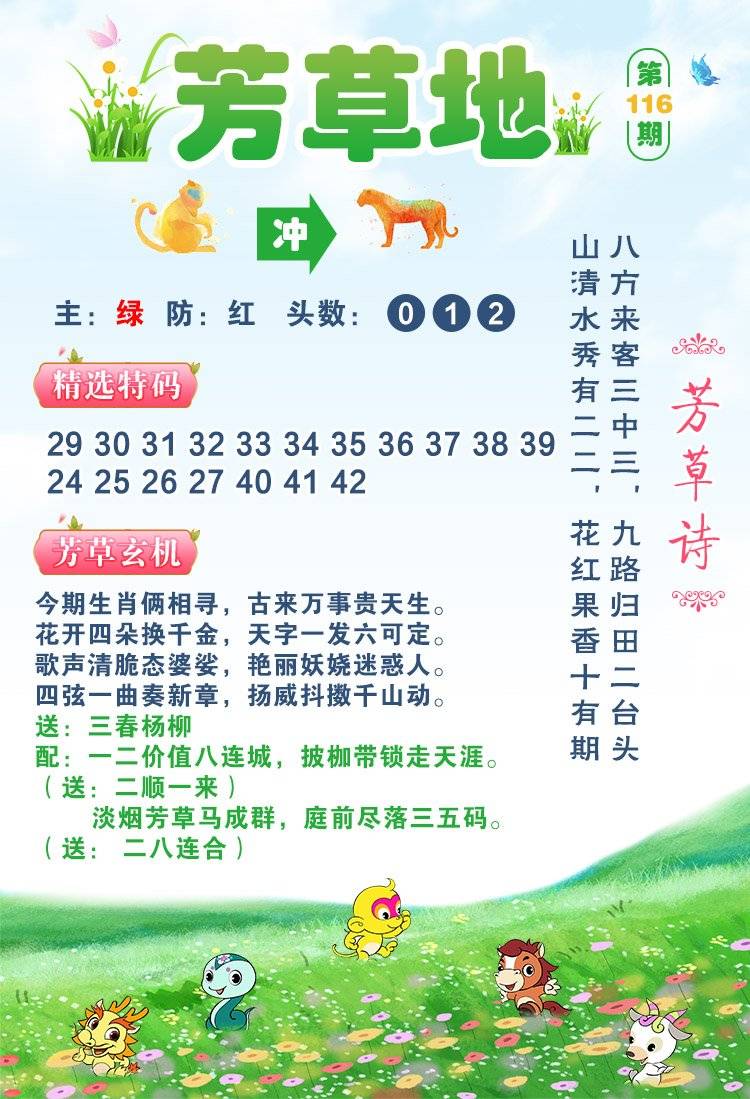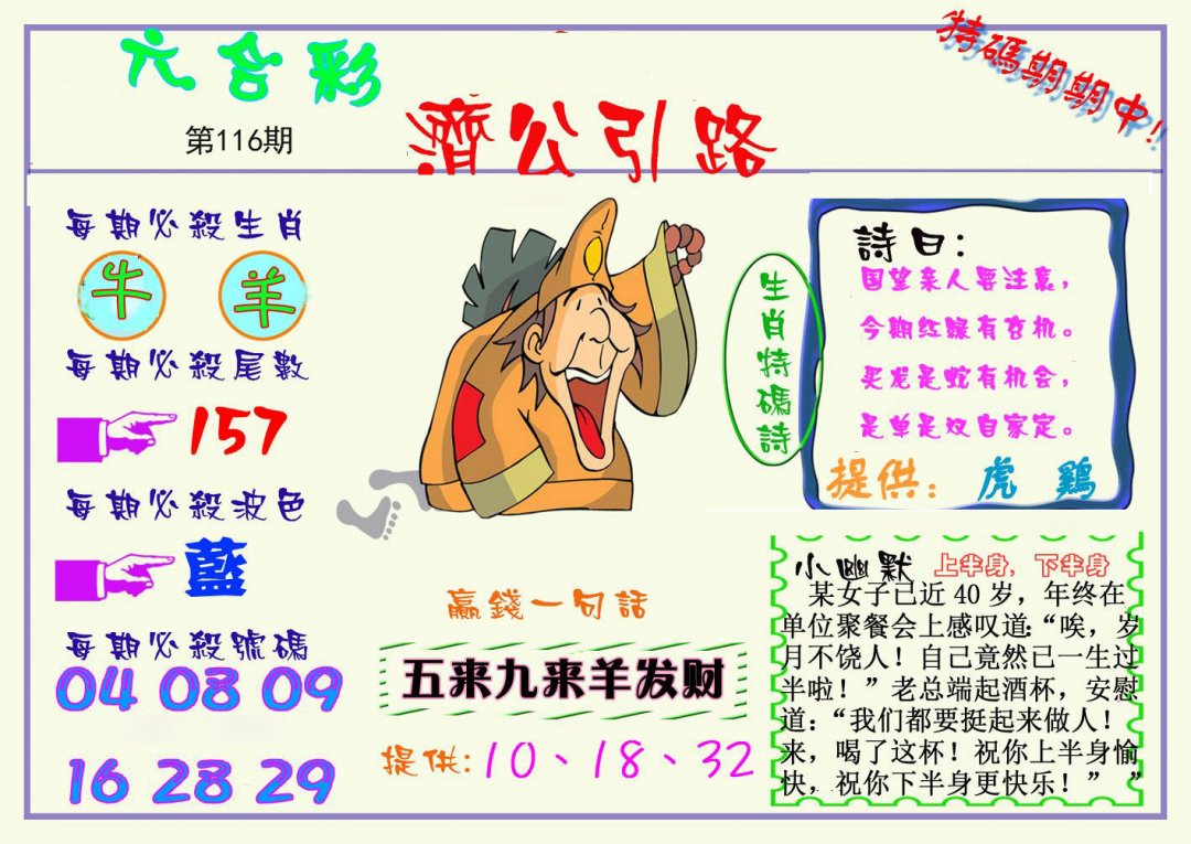 114期:幽默解析 【波色】:蓝绿 【三头】:4 3 0头 【七尾】:1 3 4 9 8 0 5尾 【平肖】:鸡鸡鸡 【平尾】:111尾 【平码】:30 36 43 29 28 41 37 |