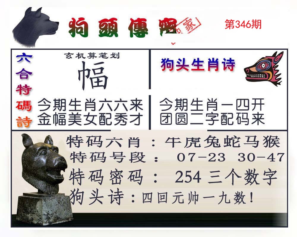 | 340期 | 猪马牛 | 狗猴 | 虎 |